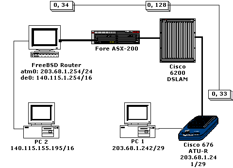 Router 基本設定 Cisco 6200 背後可以接 ATM switch 或是直接接到 router 也可以, 反正 ATM switch 只是做 PVC 的轉換, 有沒有都沒有關係. 因為實驗室沒有 ATM 介面的 router, 因此我們可以利用 Linux 或是 FreeBSD 架設一台軟體的 router. 在這裡, 我們使用的是 FreeBSD, 設定 routing 的功能很簡單, 只要開啟 IP forwarding 的功能, 設定好兩張介面卡 (一張 ATM NIC, 一張 Ethernet NIC), routing table 設定好, routing 的功能就可以 work 了. 不過 routing 只限於 IP layer, ATM NIC 到 Cisco 676 的 PVC 建好了, 就只有 router 到 Cisco 676 可以通, 如果要讓 Cisco 676 下面接的電腦也能連至 router 的話, 則必須在 Router 的 routing table 裡面加入 static routing, 將目的為 Cisco 676 底下子網域所有電腦的封包都轉送到 Cisco 676, 所以不管 Cisco 676 下面的電腦是用實體 IP 連出去, 或是使用 NAT 的功能連出去, 都是使用這一條 PVC 作連線. 假設你已經把 ATM NIC 都設定好了, 則建立 PVC 的步驟如下: